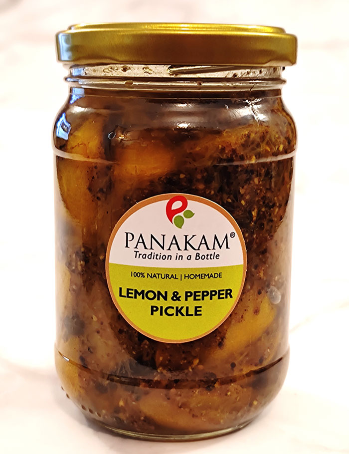 Lemon Pepper Pickle is a spicy and tangy pickle made with Lemon & Black pepper. Freshly made by mixing Lemon pieces with Black Pepper & fine spices, oil and other ingredients, it is a versatile accompaniment to many South Indian and North Indian preparations. It can also be used for a spicy tartine and a tangy spread for breads and sandwiches. This Pickle is part of the Seasonal Fresh Pickle offerings from Panakam-Tradition in a Bottle.